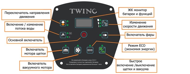 Включение моторов щеток, мотора привода колес и подача воды активируется клавишей рукоятки управления. Перед началом процесса чистки оператор выбирает с помощью отдельных сенсорных кнопок направление и скорость движения, режим подачи воды. Так же существует отдельная кнопка активации/выключения всех функций чистки (Щетки, вакуум и подача воды)